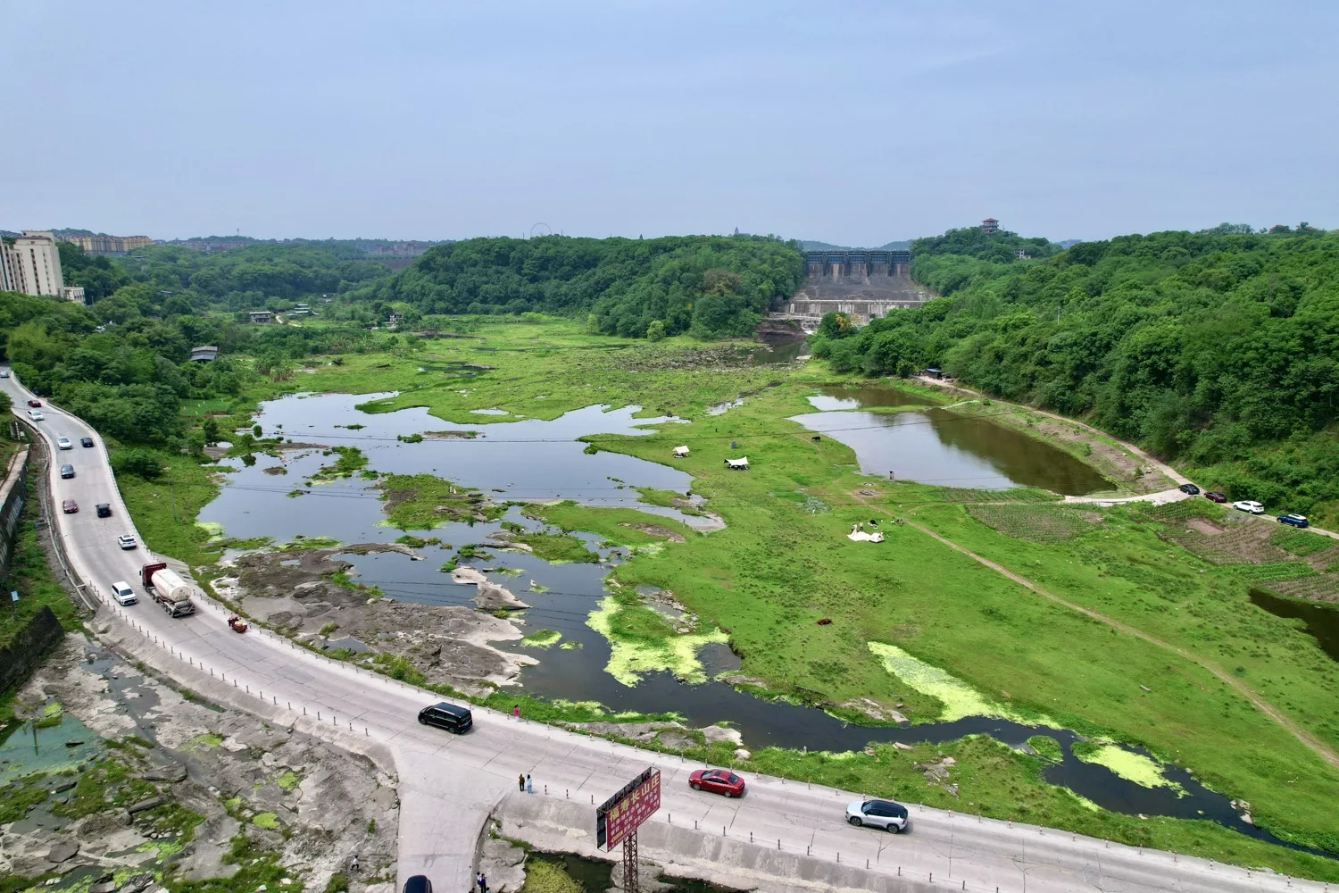 There are a lot of tourists camping on the back side of the Changshou Lake dam. It has a small area of grassland and creeks. View location on AMap